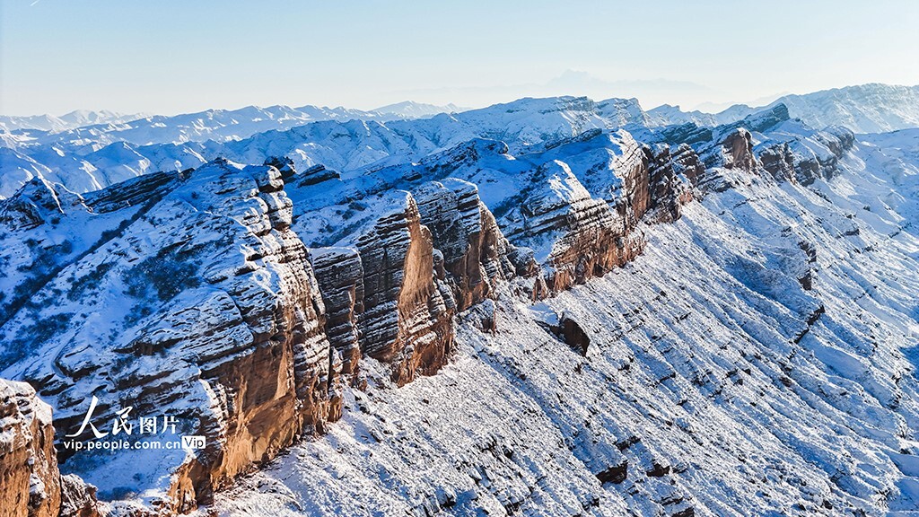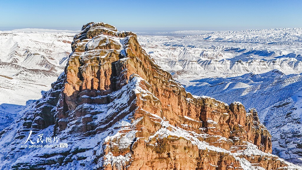 Синьцзян-Уйгурский автономный район, уезд Хутоби: красные песчаники в снегу рисуют зимнюю картину.