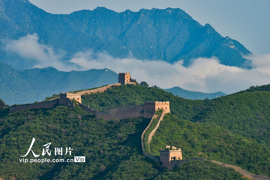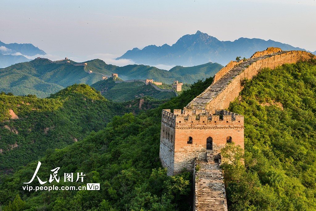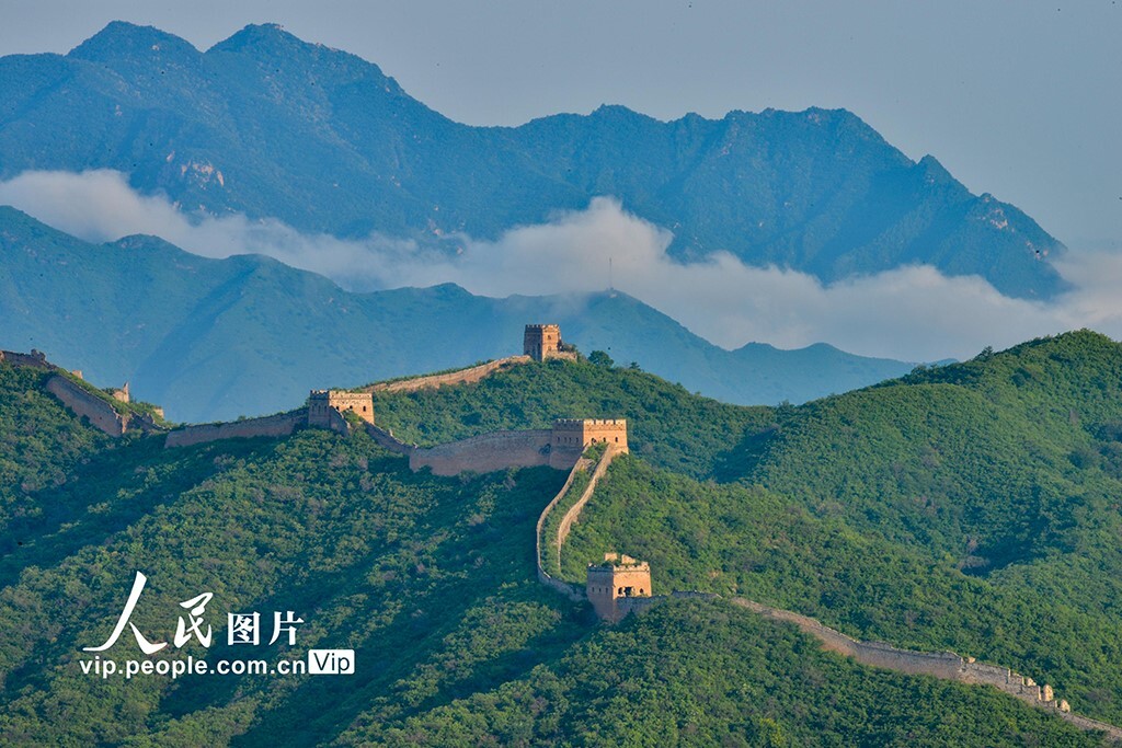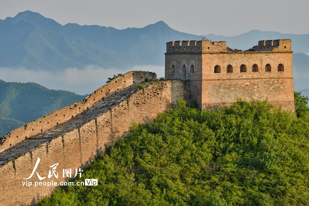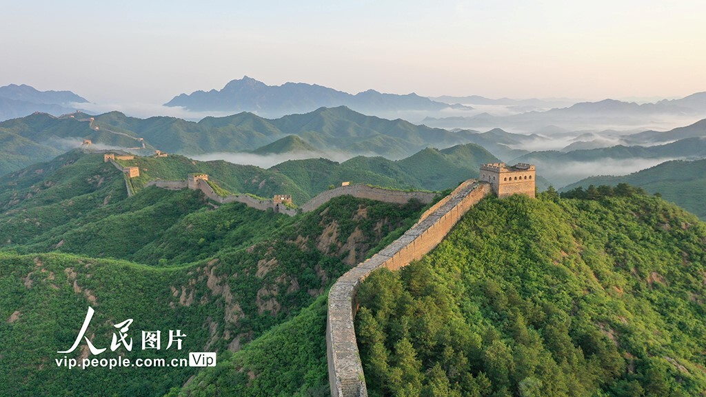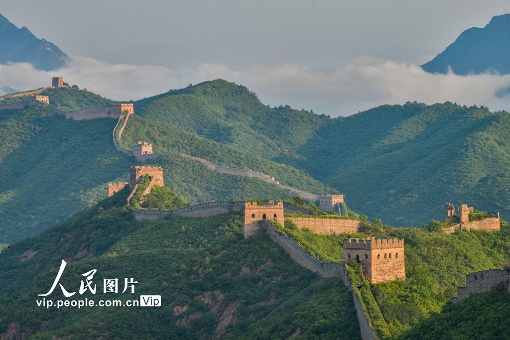 Ранним утром 17 июня 2025 года Великая китайская стена Цзиньшаньлин, уезд Луаньпин, город Чэндэ, провинция Хэбэй, отражалась в утреннем свете, туманных облаках и живописных пейзажах.